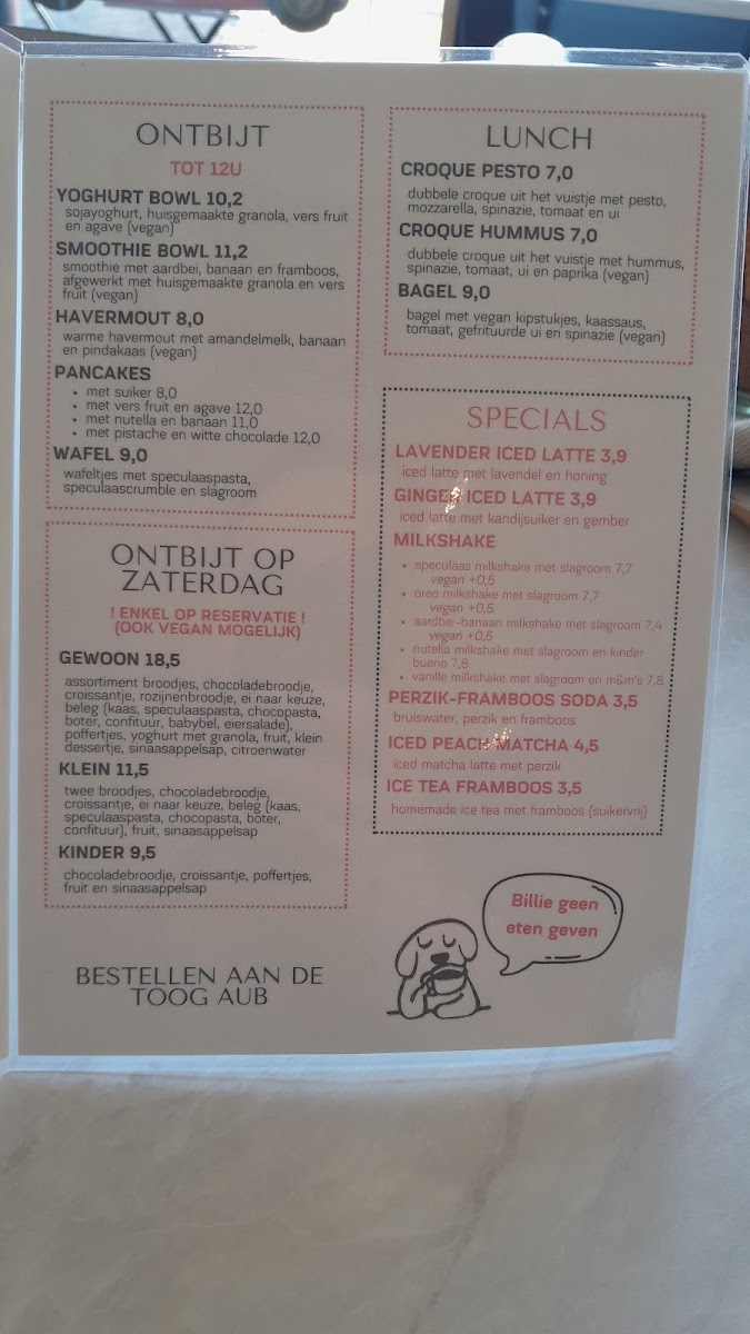 Wolf Coffee- & Espressobar in Lommel offers a delightful selection of beverages and treats that cater to various tastes. Their coffee menu shines with favorites like the rich and velvety Mocha Coffee, perfect for those who enjoy a sweet, chocolatey twist to their coffee, and the smooth, well-balanced Flat White, ideal for coffee aficionados. The Cappuccino Chocolate is another treat, blending the boldness of espresso with the indulgence of chocolate, creating a comforting and flavorful experience. For something unique, the Latte Macchiato En Gember Citroen Thee combines the warmth of a latte with the refreshing zing of ginger-lemon tea, offering a refreshing change from traditional coffee drinks. Alongside their beverages, Wolf Coffee- & Espressobar’s dessert offerings are equally impressive. The Carrot Cake, moist and packed with flavor, is a perfect match for any drink, delivering a satisfying balance of sweetness and spice. Overall, the menu at Wolf Coffee- & Espressobar combines traditional favorites with creative twists, making it a must-visit for both coffee lovers and those in search of a cozy, inviting place to enjoy a treat.